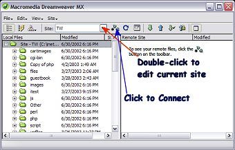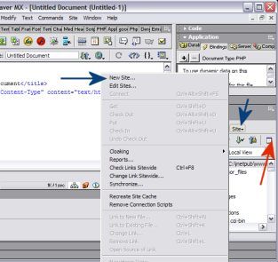 To set up Dreamweaver to connect to your web server, you want to first create a site in Dreamweaver. This can be accomplished by clicking Site...New Site in either of the places shown in fig. 1 or 2 (blue arrow). If you click on the button below the red arrow in fig. 2, you will bring up the site window. (see below). |